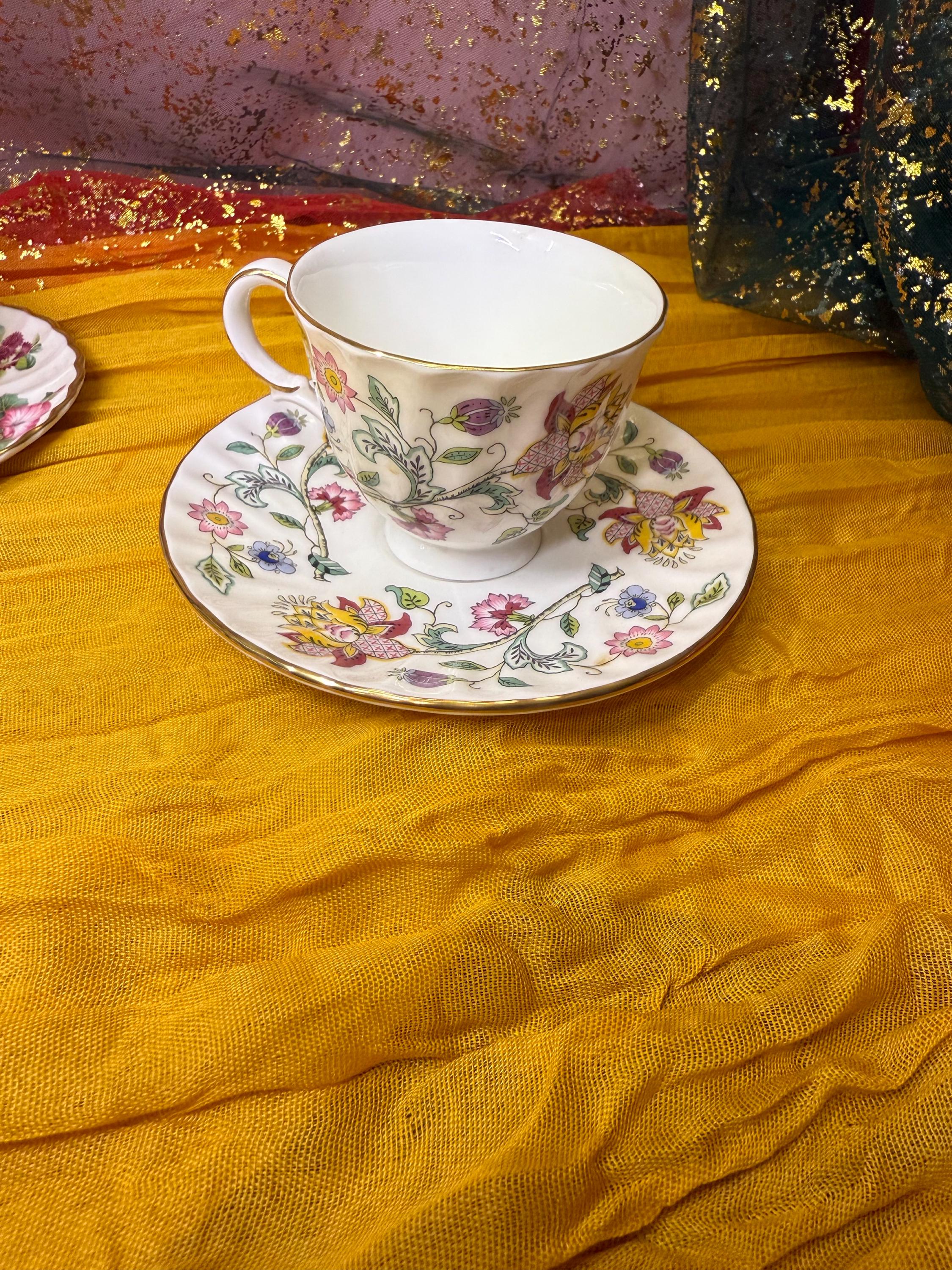 A lively and colorful floral vine pattern featuring pink, yellow, and purple blossoms with delicate green foliage on fine white bone China. Accented in gold on both rim and handle.