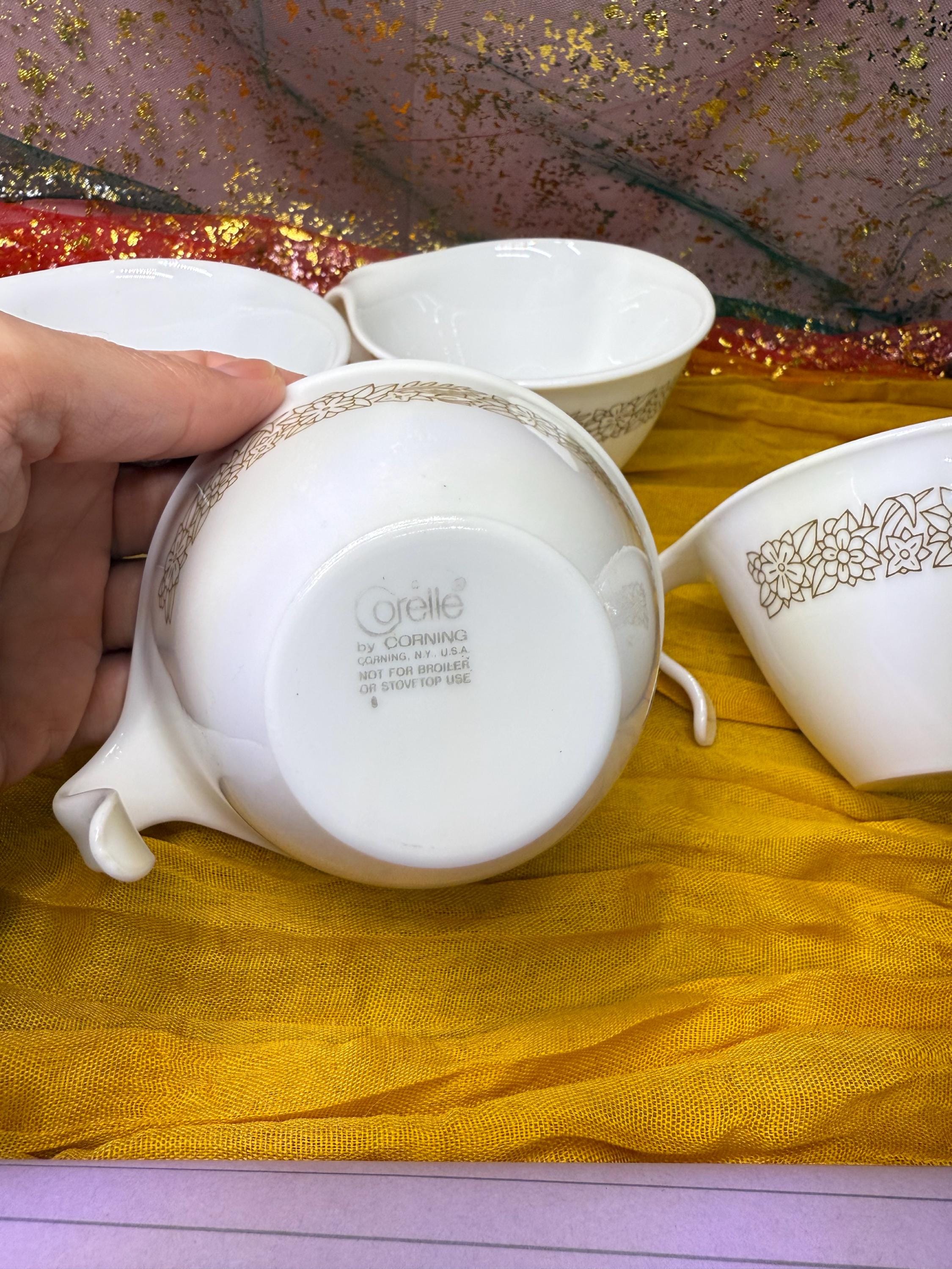 Vintage Corelle by Corning handled soup bowl in the classic Butterfly Gold pattern, produced in Corning, New York between 1970 and 1981. Each piece features the golden floral garland design that defined this era of Corelle, with a graceful, curled handle and lightweight, durable Vitrelle glass construction.